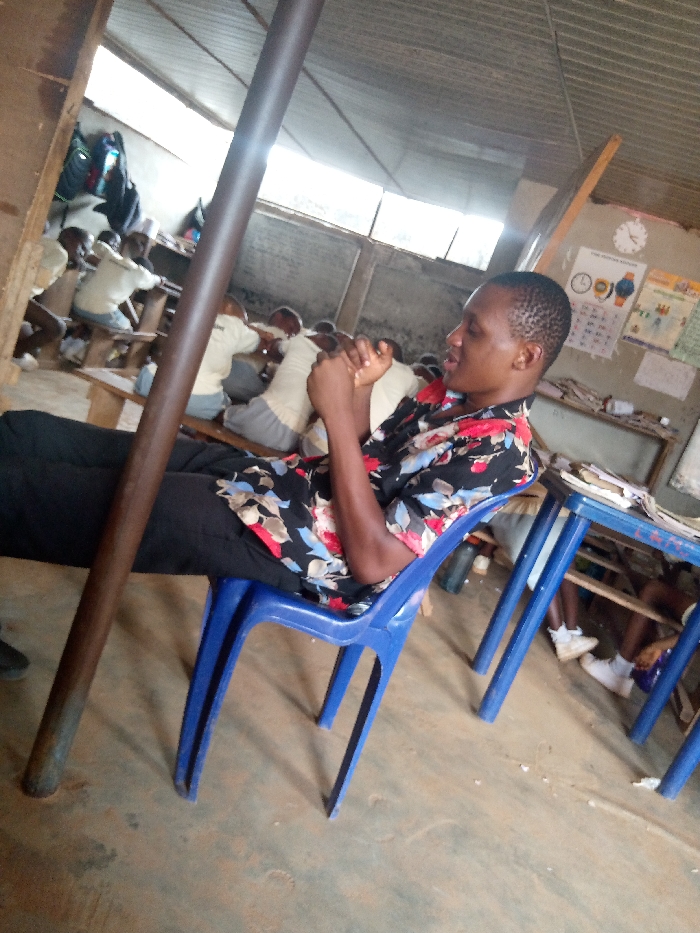 The image displays an indoor scene in Ukwu-Abwa, Nigeria, appearing to be a classroom or communal learning space