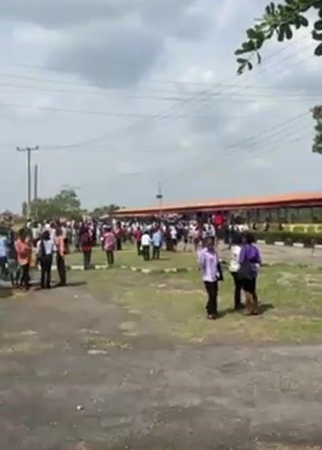 large group of people gathered outside of a building with a red roof. The people are of various ages and ethnicities, and they are standing and walking around. The environment is mostly paved, with some grassy patches, and there are trees and power lines visible. The day appears to be overcast, with a cloudy sky.