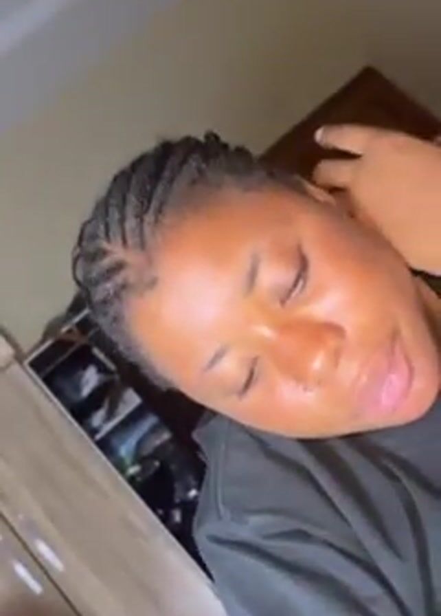 A close-up shot shows a woman with dark skin and braided hair, wearing a black shirt. The camera is positioned at a slightly high angle, capturing her face and upper body. She is initially looking down, then raises her head and looks into the camera with a neutral expression. The background is blurry, but a light-colored wall and a cabinet are visible.