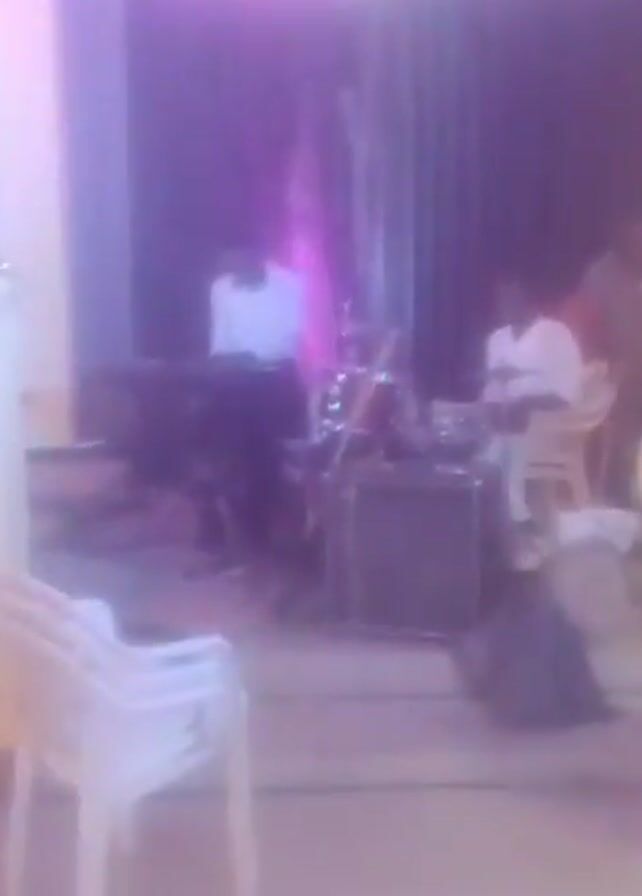 The video depicts a stage setting with musical equipment and personnel. There appears to be a keyboard player on the left, a drummer in the center, and an individual standing on the right, possibly a sound technician or another musician. Lighting casts a vibrant array of colors across the stage. A pedestal with a decorative object is located on the left side of the screen, and a white chair is placed prominently in the foreground, further emphasizing the performance or event space.