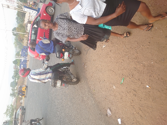 The image depicts a street scene in Adankolo, Nigeria, characterized by both vehicular and pedestrian traffic