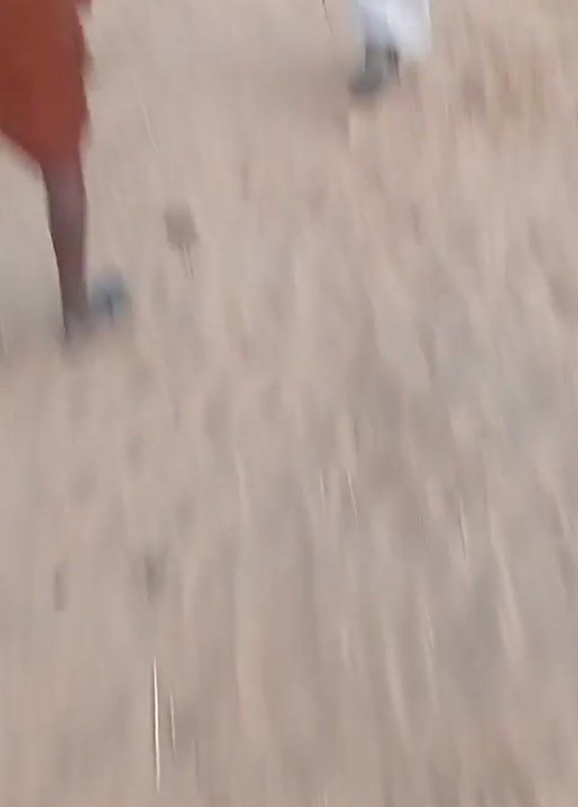two men walking on a sandy surface, away from the camera. One man is wearing a burnt orange robe, while the other is wearing a white robe. The ground is tan-colored and appears to be sandy with scattered twigs and straw. Some trees are visible in the background. The camera is low to the ground and follows the men as they move. The video seems to be shot by someone walking behind them.