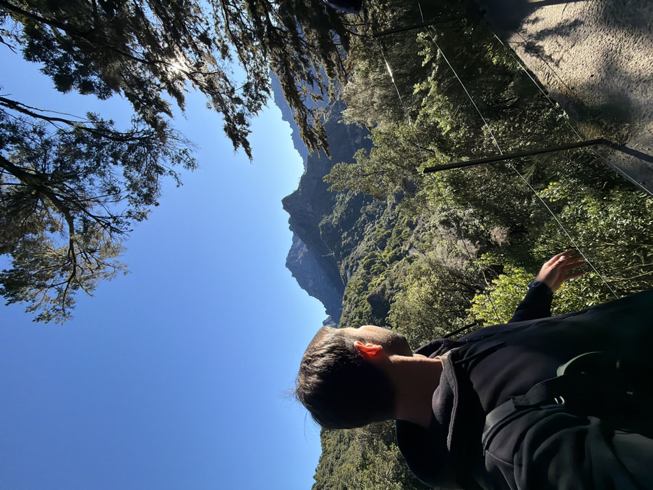 The image displays an outdoor scenic overlook located in the mountainous terrain near Ribeira Brava, Portugal. In the left-center foreground, a male individual is positioned with his back to the camera, looking towards the distant landscape. He has short, dark hair and is wearing a black hooded sweatshirt, with a dark strap from an unseen bag visible over his left shoulder. His right hand rests lightly on a multi-strand wire safety fence that runs along the right edge of a paved pathway. The midground features a deep valley densely covered with lush green vegetation, including numerous trees and shrubs, with a winding road visible on a distant slope. The background is dominated by rugged, prominent mountain peaks, also vegetated, set against a clear, deep blue sky. The upper portions of the frame are partially obscured by the dark silhouettes of tree branches. Bright sunlight emanates from the upper right, creating a visible glare and casting strong shadows on the pathway.
