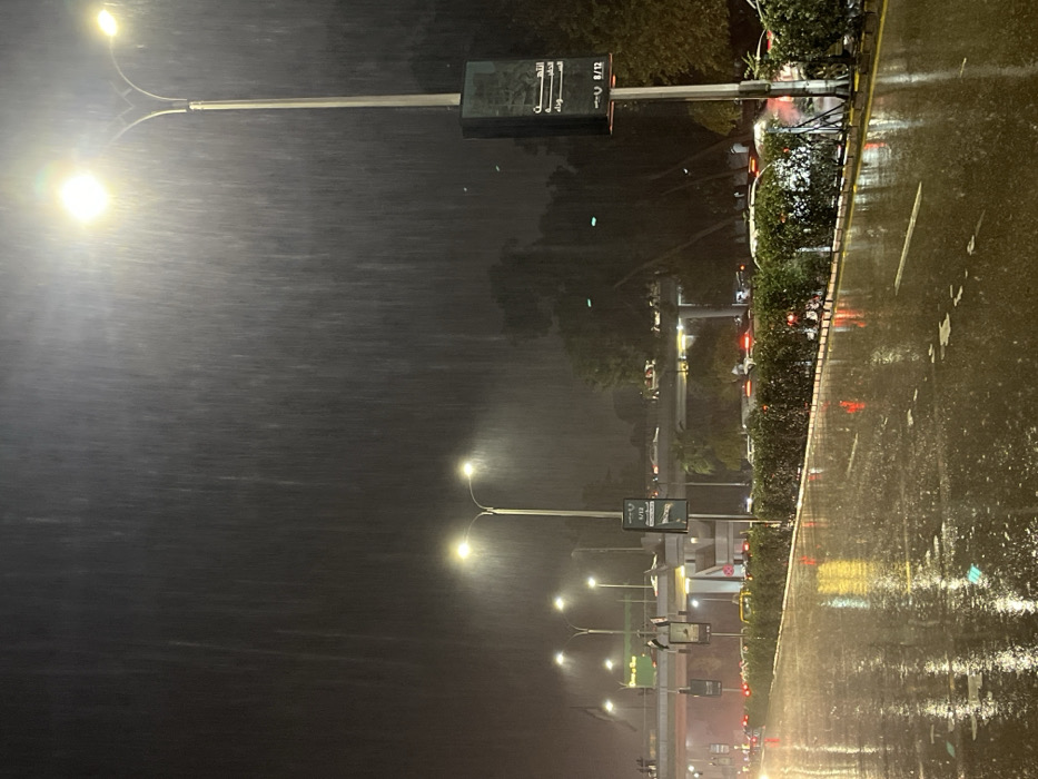 A nighttime urban scene depicts heavy rainfall obscuring details. Streetlights illuminate the downpour, creating bright spots and reflections on the wet pavement. A row of light poles with digital signs lines the side of the road, punctuated by lush greenery. The rain blurs distant buildings and traffic lights, adding a sense of mystery and depth to the image.