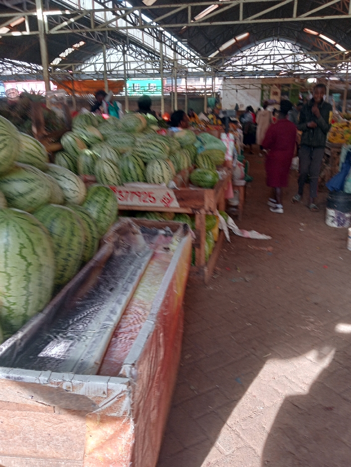 A bustling marketplace scene unfolds beneath a metal-framed roof. Heaps of watermelons dominate the foreground, piled high on wooden stands. An empty, wooden trough-like container sits nearby. Further back, people mill around various stalls, creating a lively atmosphere. A man in dark clothing stands observing, while another woman in a red dress walks through the market. The floor is paved with reddish-brown bricks, catching the sunlight.