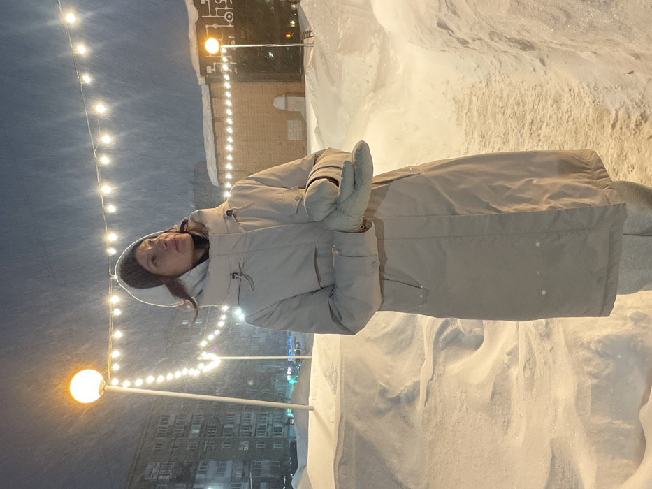 This image depicts a female individual outdoors at night during a heavy snowfall event in Central Square, Izhevsk, Russia