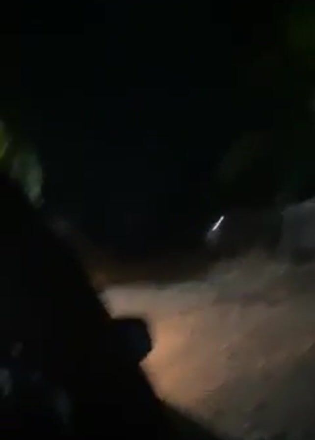 car driving down a dirt road at night. The road is lined with trees and bushes. There are lights in the distance. A person in a red shirt can be seen on the side of the road. The camera is inside the car, looking out of the driver's side window. The interior of the car is dark.