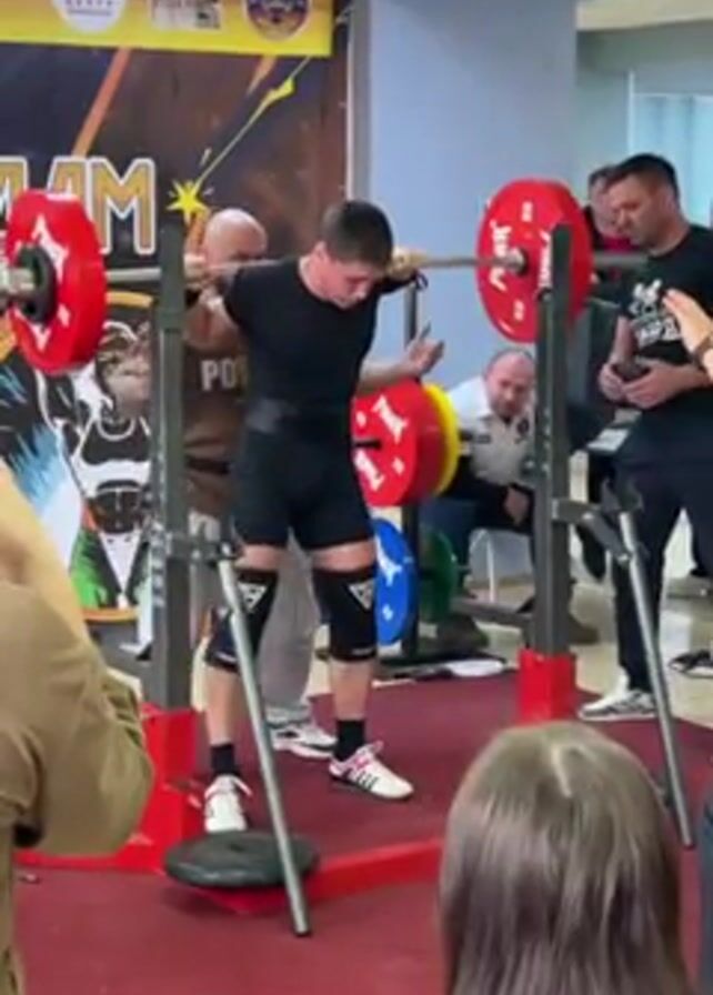 A young man is performing a squat with a barbell loaded with weights in what appears to be a powerlifting competition or training setting