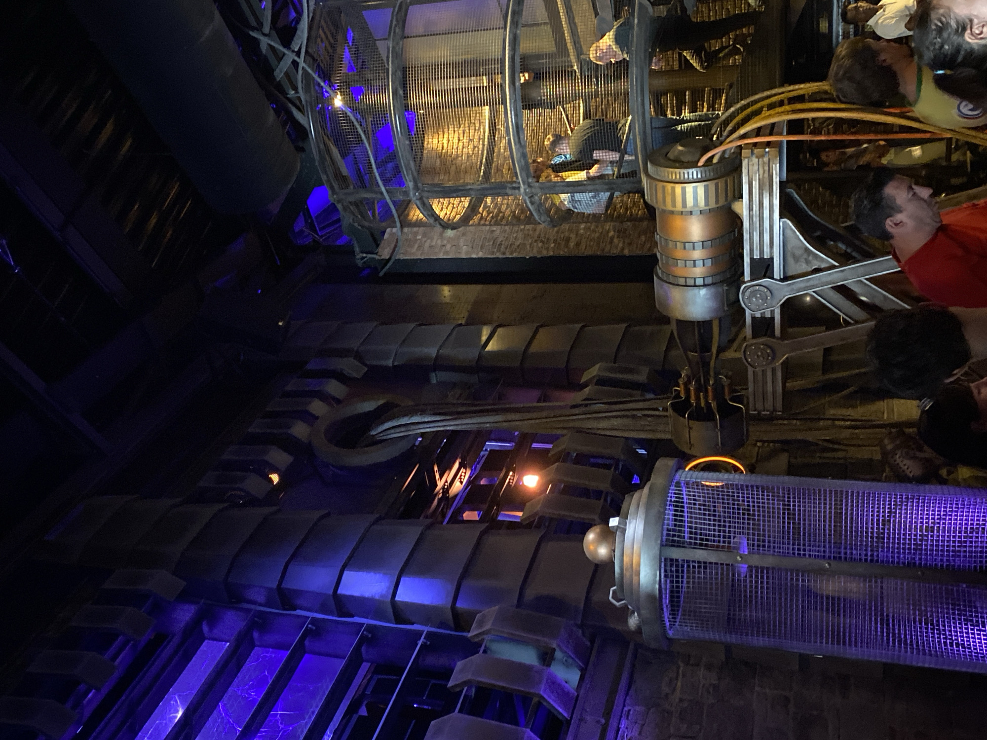 The image depicts an interior space with industrial theming, possibly a ride or attraction. A large metal cage structure, likely a component of the ride, is visible with people inside. Other metal structures and pipes are present, illuminated by blue and orange lighting. Some people are visible standing nearby, observing the scene. Based on the 'Rust' query, this is likely at the Europa-Park theme park in Rust, Germany.