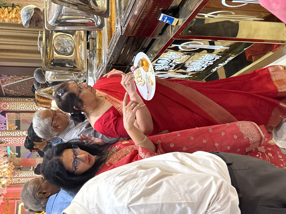 A group of people is gathered around a buffet. A woman in a red sari holds a plate of food. Another woman in a red sari sits beside her. A man with gray hair stands behind them. The buffet features stainless steel food warmers. Other guests and decorative elements appear in the background.
