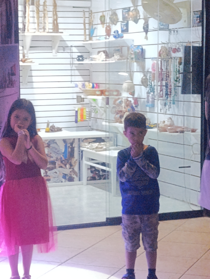 The image depicts an indoor scene in Playa El Agua, Venezuela, featuring two young children standing on a light-colored tiled floor in the foreground, positioned before a large glass partition. To the left, a young girl, approximately 5-8 years old, wears a sleeveless pink dress with a tulle skirt. Her dark hair is long, and her hands are clasped together, raised towards her mouth. She is partially illuminated by a magenta-hued light source from the left. To her right, a young boy, also approximately 5-8 years old, wears a blue long-sleeved shirt with a subtle pattern and light-colored camouflage-patterned shorts. His dark hair is short, and his hands are similarly clasped together, raised to his chin/mouth area. Behind the children, visible through the clear glass partition, is a brightly lit retail space, likely a souvenir or craft shop. The shop features white slatwall panels with various white shelves displaying numerous items. On the upper shelves, multiple tall, slender wooden sculptures, possibly abstract figures or carvings, are visible. Hanging items include mask-like objects, shell crafts, small pictures, and a significant collection of colorful necklaces and bracelets arranged on vertical displays and in baskets. A white oscillating fan is mounted high on the right side of the shop's interior. White display tables are also present within the store, featuring additional merchandise. The floor inside the shop appears to be tiled, similar to the foreground.