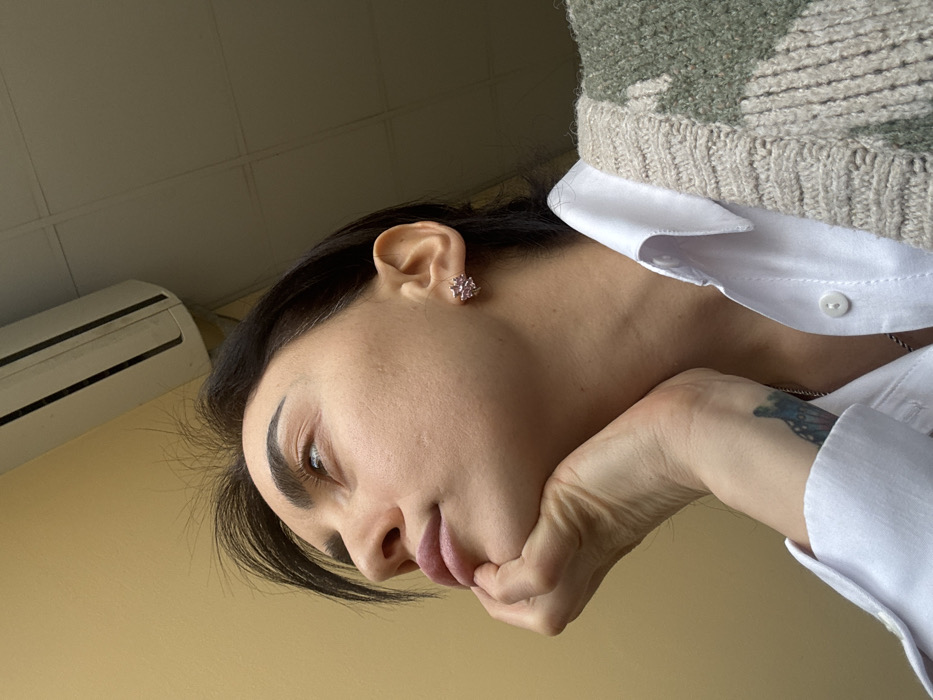 An indoor, close-up portrait in Tbilisi, Georgia, features an adult female from the upper torso upwards. She is looking upwards and towards the right side of the frame, with her left hand positioned under her chin, fingers curled. She has dark hair and prominent eyebrows. A pink, flower-shaped stud earring is visible in her right ear. She wears a white collared shirt beneath a knitted cardigan featuring a pattern in shades of beige and olive green. A thin metallic chain necklace is visible, and a blue butterfly tattoo is present on her left wrist. The background consists of a plain light yellow wall, transitioning to a light-colored ceiling in the upper right, where a white air conditioning unit is mounted. Faint grid lines are visible on the ceiling.