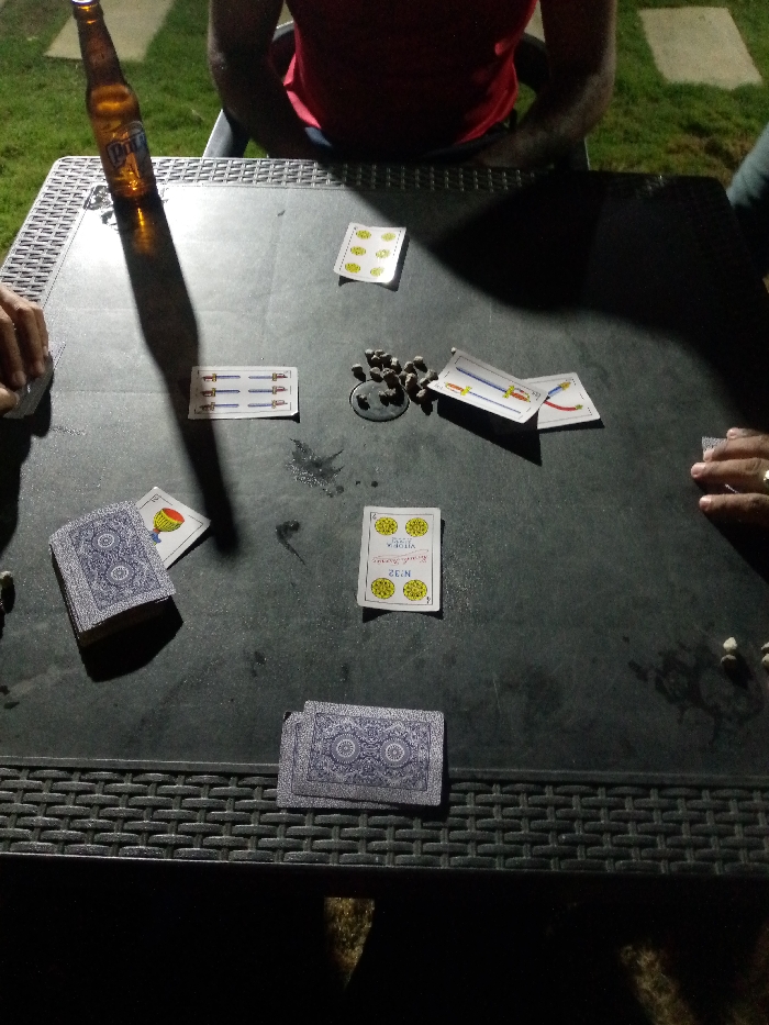 A game table hosts a casual card game. Scattered cards of a Spanish deck are visible: a “Rey” card, the three of swords, coins, and other scattered cards. A bottle of beer casts a shadow on the table. Players' hands are visible on opposite sides of the table with seeds or stones are in the table's center. The table's dark surface and the surrounding darkness suggest an outdoor nighttime setting.