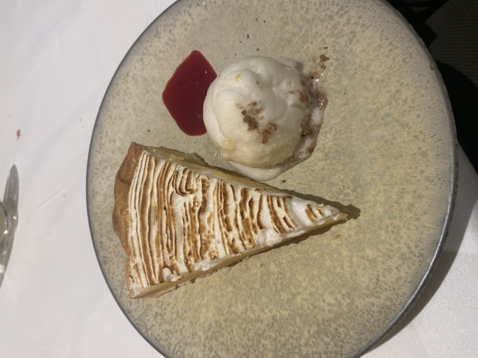 A close-up, high-angle view displays a dessert presented on a round, speckled light gray ceramic plate with a dark gray rim, resting on a white tablecloth. The plate holds a triangular slice of lemon meringue pie on the left, featuring a golden-brown pastry crust, a light yellow lemon filling, and a thick layer of extensively torched white meringue with distinct, horizontal, dark-brown striations. To the right of the pie, a scoop of white ice cream shows signs of partial melting at its base and is dusted with dark brown particulate matter. An irregular, vibrant red viscous liquid, consistent with a fruit coulis, is situated on the plate adjacent to the ice cream. A blurred, light-colored object, possibly glassware, is partially visible in the upper left background. No individuals are present. The scene depicts a prepared dessert in a dining environment within La Wantzenau, France.