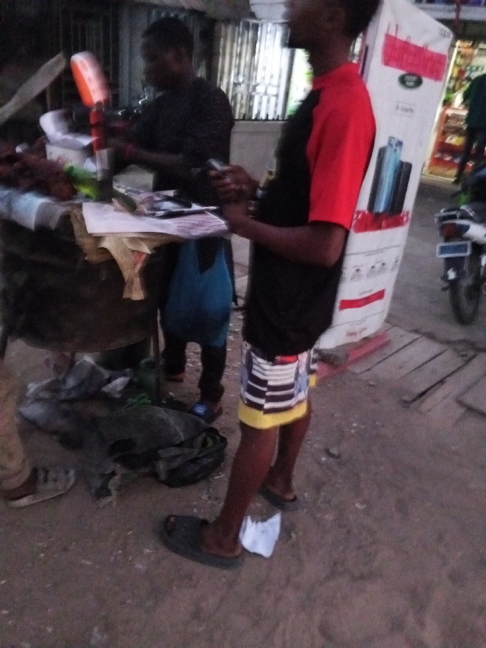 Two men stand near a food stand on a dirt ground. The man to the left stands near the stand and a scale. The second man wears a black and red shirt with black and white shorts, and a gray slide. A display for phones stands behind him with a motorcycle near the corner. A white piece of trash lies by his left foot.