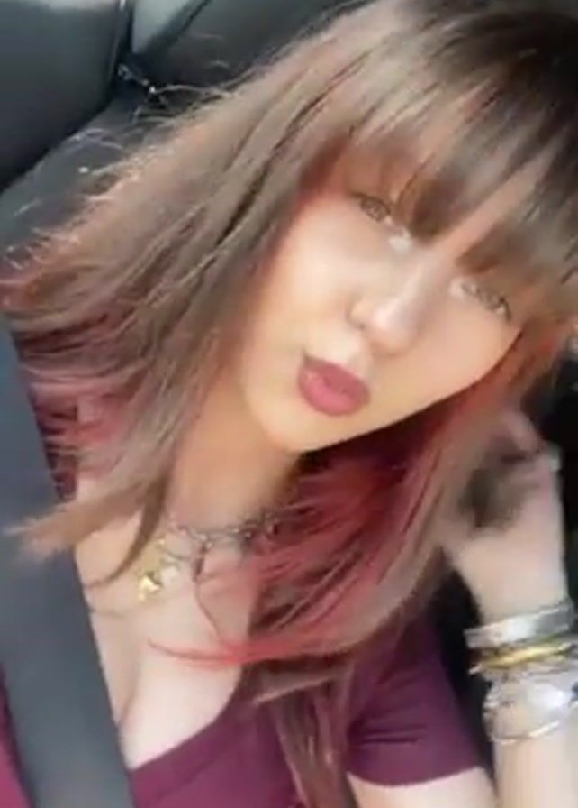 A young woman is in the passenger seat of a car, wearing a seatbelt and recording a video. She has medium-length brown hair with bangs and pink highlights framing her face. She is wearing a maroon V-neck shirt and multiple rings and necklaces. She looks directly at the camera and smiles. The interior of the car is visible, with dark leather seats. The angle of the video shifts during the recording.