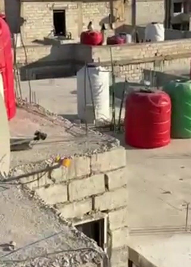 rooftop in what appears to be a Middle Eastern city. Several red, white, and green water tanks are scattered across the flat surface, along with a satellite dish. A man dressed in white can be seen in the background talking on a mobile phone. The rooftop is made of concrete blocks, and there are other buildings visible in the distance. The sky is clear and the lighting indicates it is daytime.