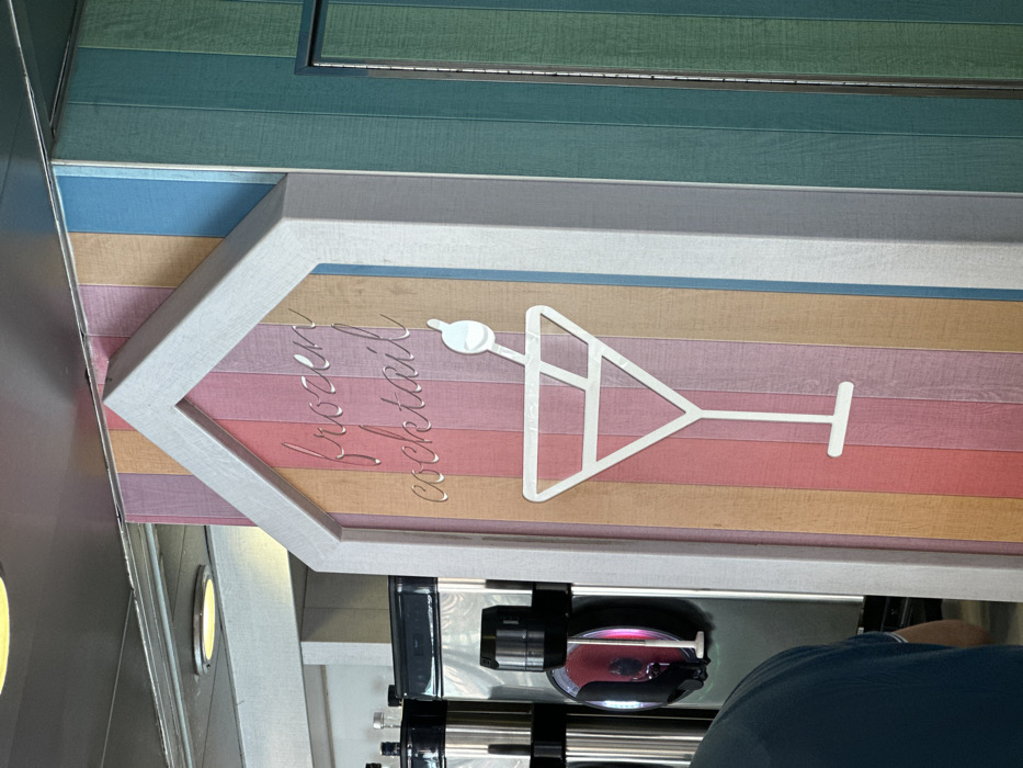 The scene depicts an interior view within a commercial establishment in Puerto del Rosario, Spain. Central to the frame is a white-framed, house-shaped sign. The sign's background consists of vertical planks in pastel colors including pink, orange, light brown, purple, and light blue. Emblazoned on this background are the metallic, cursive words "frozen cocktail," positioned above a white outline graphic of a martini glass with a circular garnish on a stick. To the right of the central sign, a wall continues with vertical planks in shades of green and teal. To the left, a beverage service counter features at least two commercial stainless steel dispensers. One dispenser has a black top and a clear section displaying a red liquid, with a white dispensing spigot. Multiple bottles are visible on a shelf situated above the dispensers. In the lower-left quadrant, the upper back of an individual, wearing a dark-colored shirt, is partially visible, facing away from the camera. The ceiling, visible at the top, is light-colored and equipped with recessed circular lights. No active interactions between individuals or objects are depicted.