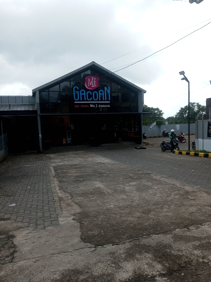The image captures the exterior of a "Mie Gacoan" restaurant, identifiable by its prominent blue and pink signage