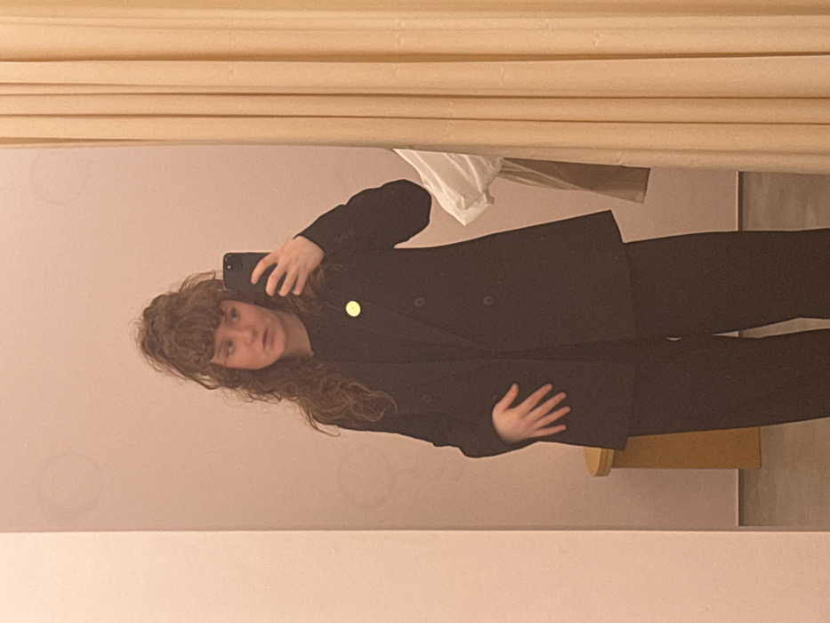 A woman with curly hair takes a mirror selfie. She wears a black double-breasted blazer with a circular yellow pin and matching black pants. A cell phone is visible in her right hand. The mirror reflects a cream-colored wall and ceiling, and a glimpse of a white bed or bedding. The overall color palette is muted and soft.