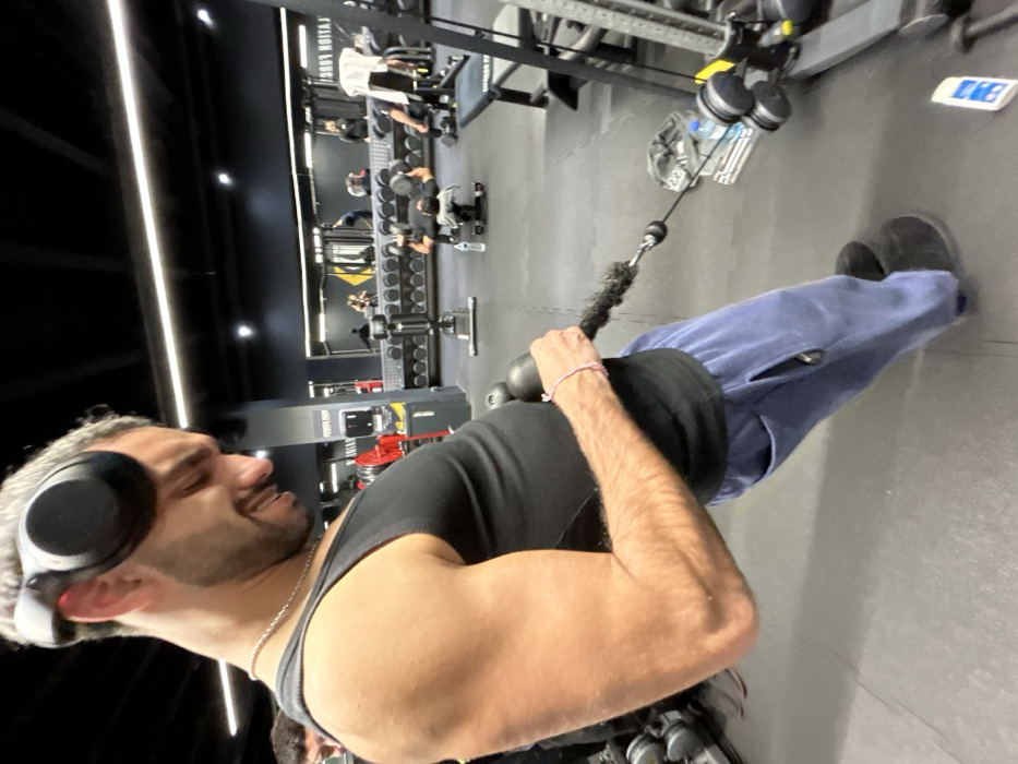 A man in a black tank top and blue sweatpants is pulling a cable machine at a gym. He has headphones on and is smiling. Other people are working out in the background. The gym has black walls and floors with bright overhead lighting. There are various workout machines and equipment visible in the background, including weight racks and cable machines.