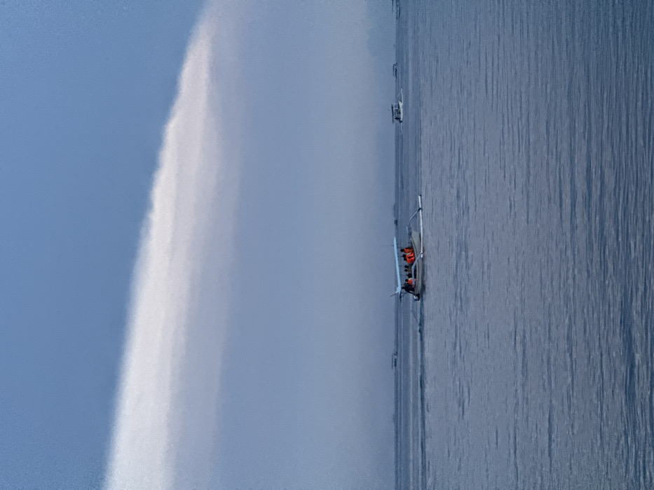 A maritime scene in Kalibukbuk, Indonesia, depicts calm, dark blue-grey waters under an overcast sky. In the mid-distance, a light-colored outrigger boat, equipped with a light blue canopy structure and extended outriggers, moves rightward, leaving a faint wake. Within this boat, approximately six individuals are seated, with at least three visibly wearing orange life jackets. Several other boats appear as indistinct forms further on the hazy horizon. The sky is dominated by a wide, horizontal band of white and light grey cloud, bordered by darker blue-grey sky above and below.