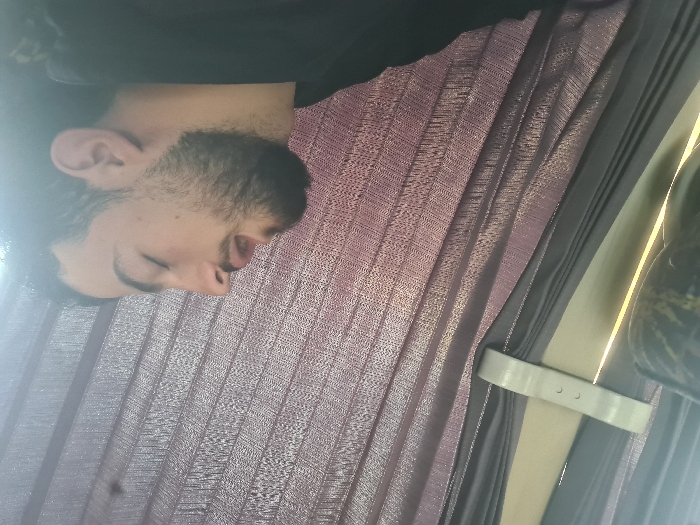 The image depicts a young adult male, appearing to be asleep, located in Al-Kiswa, Syria. The subject, positioned on the right side of the frame, has light skin, dark hair, and a short beard. His head is tilted back, with his eyes closed and mouth slightly open. He is wearing a dark-colored top. The background features layered curtains; a dark, solid-colored curtain is visible on the left, secured by a light-colored, flat strap with two visible perforations. Behind this, a lighter, textured, reddish-purple curtain is present. Bright illumination emanates from the left side, behind the curtains. A dark, patterned object is partially visible in the upper left background, suggesting it may be a headrest or part of a seat. The scene indicates an interior environment, possibly within a vehicle or a room with a window.