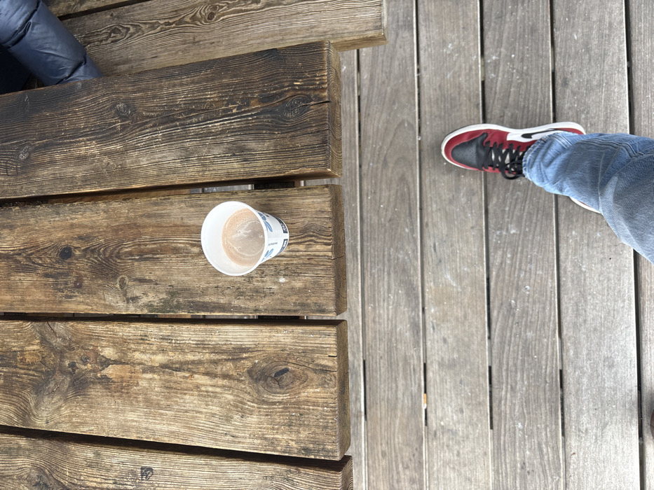 The scene, located in Lièpvre, France, is depicted from an overhead perspective, showcasing an outdoor setting. In the lower frame, the left leg of an individual is visible, clad in light blue denim jeans and a red, black, and white sneaker. This leg is positioned on a ground surface composed of weathered horizontal wooden planks. Centrally, a rustic wooden table, constructed from wide, dark brown, visibly grained and knotted planks, holds a white disposable paper cup. The cup contains a light brown, foamy beverage and exhibits a faint blue design on its exterior. A portion of a dark blue or black puffy jacket, belonging to a second individual, is discernible in the upper right background, suggesting another person is seated at the table. The visible environment consists primarily of wooden structures.