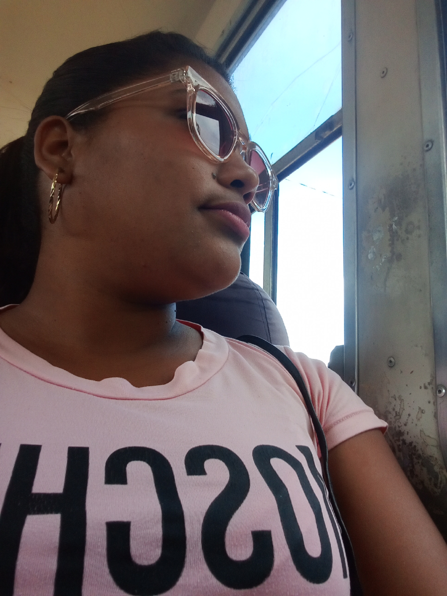 A dark-skinned individual, identified as female, is depicted seated within a vehicle in Parroquia Ocumare, Venezuela. She is positioned in profile, facing right, looking out of a window. Her dark hair is pulled back. She wears transparent-framed cat-eye sunglasses with reddish-tinted lenses, large gold-colored textured hoop earrings on her left ear, and a small dark piercing on her right nostril. A small mole is present above her upper lip on the right side. She is wearing a light pink short-sleeved t-shirt with large black lettering on the front, with "HOS" partially visible. A black strap, likely from a shoulder bag, crosses her left chest. To her right is a vehicle window, through which a light blue sky and bright daylight are visible. The windowpane shows minor cracks. Adjacent to the window, a vertical, light-colored metal panel, secured by rivets or screws, exhibits staining and wear. A dark headrest or seat back is partially visible behind her. The scene is brightly illuminated.