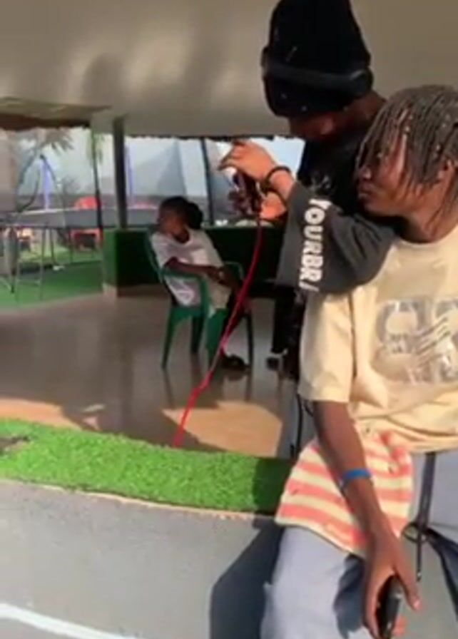 several young people in an outdoor setting. One person is filming another, who is wearing a black beanie with ears, an orange t-shirt, and black pants, as they sit on a ledge. Another person is sitting on a green chair inside a covered area with a polished floor. The outdoor area includes artificial turf, chairs, and tables. The overall atmosphere appears casual and friendly.