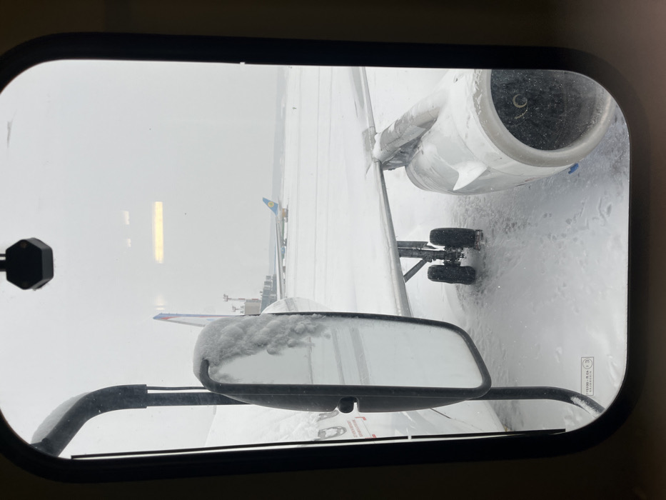 - "View from an aircraft cabin window shows a snow-covered tarmac and the wing of the plane, including its engine and landing gear" by FM-DjANo1, licensed under CC BY 4.0