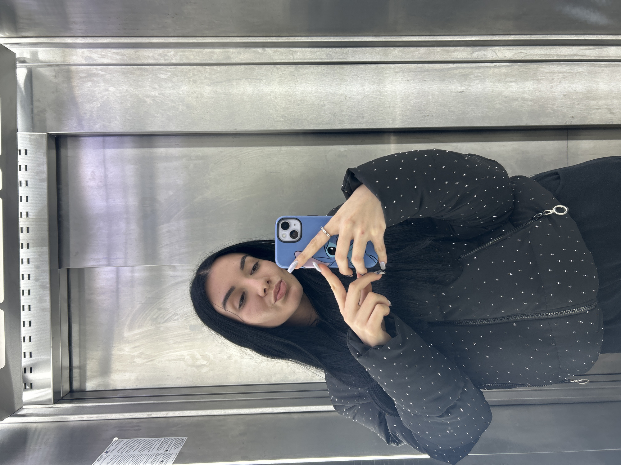 A young adult female with long, straight, dark hair and a light complexion is captured in a selfie taken inside an elevator. She stands facing the reflective brushed stainless steel elevator doors, which show her reflection. Her lips are pursed in a pout. She wears a black puffer-style jacket adorned with numerous small, reflective silver dots or studs, with a visible zipper pull on the right side. She holds a light blue smartphone, equipped with a case featuring a character design (resembling Stitch), with both hands positioned in front of her chest. Her manicured nails are elongated and light-colored. A silver-colored ring is visible on the ring finger of her right hand. On the left wall of the elevator, a white paper notice with black text is affixed. The overhead panel features multiple horizontal rectangular slots. The specific location within Varna, Bulgaria, cannot be determined from the visual information provided in the image.