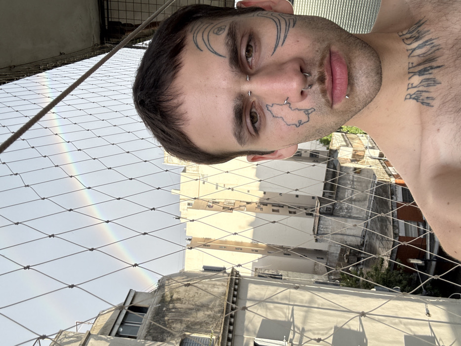 A fair-skinned person poses for a selfie, exhibiting numerous facial piercings and tattoos. The tattoos include decorative designs above the eyebrow, an outline of a region on the cheek, and script on the neck. The background reveals buildings and a double rainbow visible through a safety net. The composition is angled.