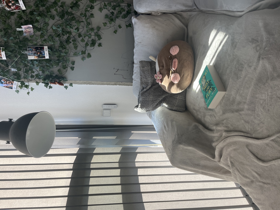 The image depicts an indoor scene in Eindhoven, Netherlands, featuring a lounging area illuminated by natural sunlight. A light gray upholstered sofa, draped with a matching plush blanket, occupies the foreground and center. On the sofa, a dark gray textured throw pillow is positioned against the backrest, alongside a round, brown plush toy with pink facial features and a small pink flower accessory on its head. A paperback book titled "A COURT OF MIST AND FURY" by Sarah J. Maas rests face up on the blanket, partially highlighted by sunlight. To the left, a window fitted with vertical blinds allows sunlight to stream through, casting distinct striped shadows across the room and onto the sofa. Above this area, a dark gray industrial-style pendant lamp is mounted. The white wall on the left features two wall-mounted control panels. The adjacent gray wall on the right is adorned with artificial green ivy vines from which several small printed photographs are clipped and suspended. An exposed, rough concrete section is visible on the inner edge of this right wall. No individuals are present in the scene.