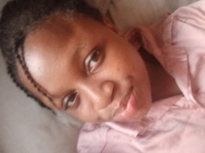 The image displays a close-up, tilted portrait of a young woman with a dark skin tone. Her head and upper torso are visible, positioned at an approximate 45-degree angle. She has dark hair styled in small braids or cornrows along her hairline on the left side of the frame, with the rest of her hair dark and closely cropped. Her eyes are open, and she is looking directly towards the camera with a subtle expression. Her lips appear full, and there is a slight sheen on them. She is wearing a light pink, possibly satin or silk, garment that drapes across her upper body. The immediate environment behind and around her is largely out of focus, appearing as a soft, light-colored surface, possibly a pillow or bedding, indicative of an indoor setting. The specific location within the city of Agani, Nigeria is not discernible from the visual evidence.