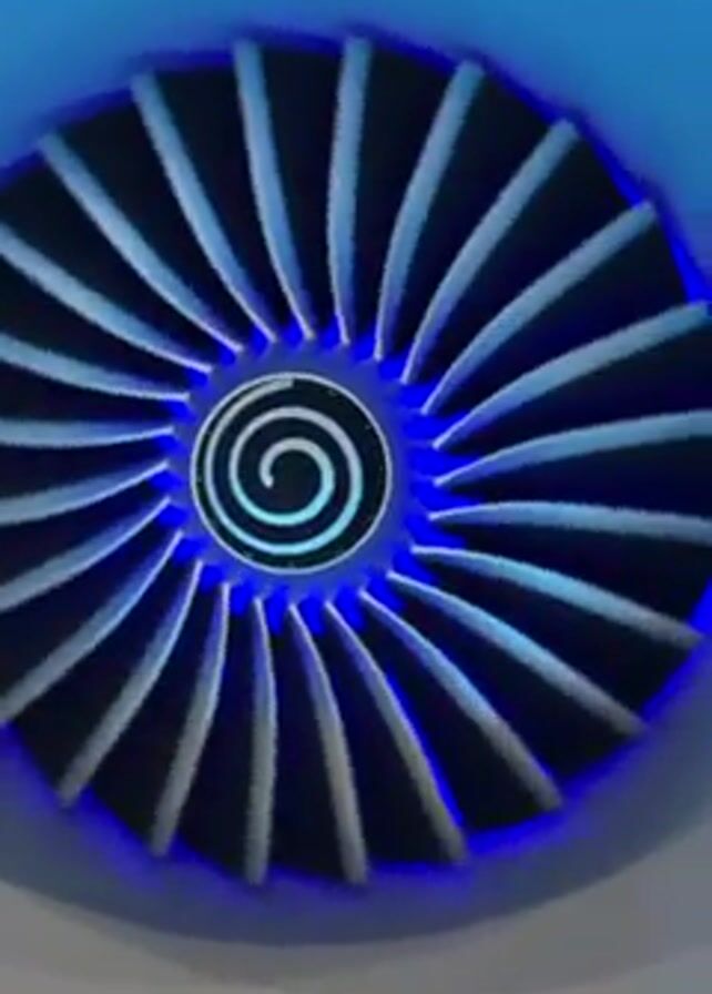 A close-up shot shows an engine fan with blue lighting. The fan has numerous blades and a spiral design in the center. The image is stable and focused on the central fan. The outer casing of the engine is partially visible.