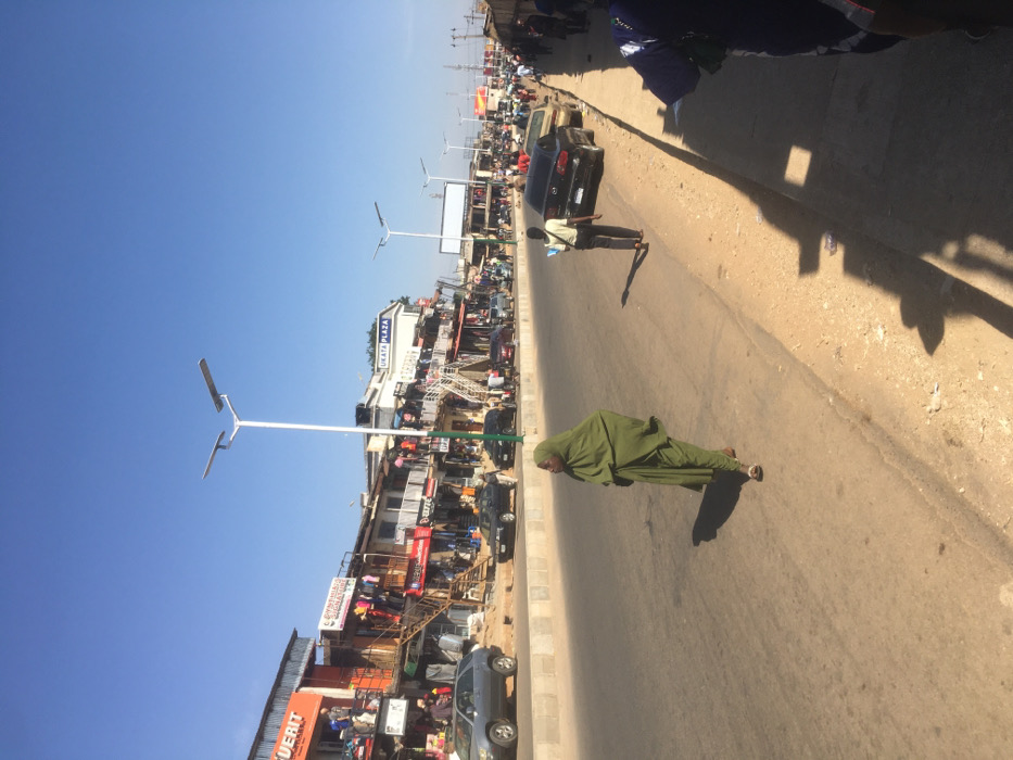 This image depicts a bustling street scene in a commercial area of Jos, Plateau State, Nigeria, specifically near Ukata Plaza and Derit, visible on building signage. The scene unfolds under a clear, bright blue sky with strong daylight, casting distinct shadows. In the foreground, an asphalt road occupies the left side, showing signs of vehicle traffic and dirt. A concrete median separates the main road from a row of multi-story commercial buildings on the left. A woman, dressed in a full olive-green abaya or similar garment and sandals, walks from left to right across the roadway, her gaze directed towards the right. To her right, further down the road, a man in a light shirt and dark trousers walks away from the camera, carrying a shoulder bag. The right side of the image features a dusty, unpaved shoulder bordering the road, where several vehicles are parked parallel to the curb, including a dark sedan and a beige car. Further down this shoulder, more pedestrians are visible. Shadows of unseen figures extend from the immediate right foreground onto the shoulder. Along the left side of the street, a continuous row of commercial buildings lines the thoroughfare. These structures, including "UKATA PLAZA" and a building with "DERIT" signage, feature multiple levels with open shop fronts displaying various merchandise, notably clothing. External metal staircases provide access to upper floors. Numerous people are visible within and around these shops, on balconies and at street level. Several cars, including a silver SUV, are parked in front of these establishments. Tall, white street light poles equipped with dual horizontal solar panels are spaced along the median and road, extending into the distance. An empty billboard frame stands on the right side of the street further down. The overall environment suggests a vibrant urban commercial district.