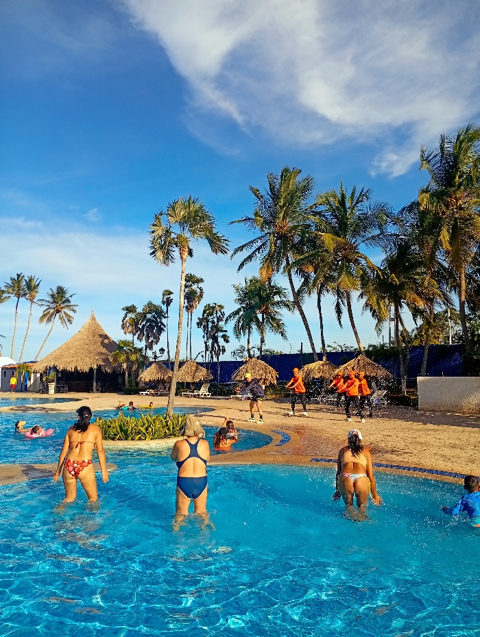 The image depicts an outdoor recreational area at a resort in Playa El Agua, Venezuela, under a clear blue sky with scattered white clouds. Numerous palm trees are distributed throughout the scene, creating a tropical environment. In the foreground, a large, irregularly shaped blue swimming pool contains several individuals. Three adult females, viewed from the rear, are wading: one in a floral bikini to the left, one in a blue one-piece swimsuit in the center, and another in a light-colored bikini to the right. A child in a blue long-sleeved swim shirt is partially visible on the far right. Further into the pool, another person is on a pink inflatable ring. Adjacent to the pool is a sandy ground area where a group of six individuals is engaged in a coordinated activity; five wear orange shirts and dark bottoms, while one wears a dark top and light shorts. To the left, a large thatched-roof building, likely a bar or restaurant, stands next to the pool, with several smaller thatched-roof umbrellas and sun loungers nearby. A dark blue structure or fence is visible in the background.