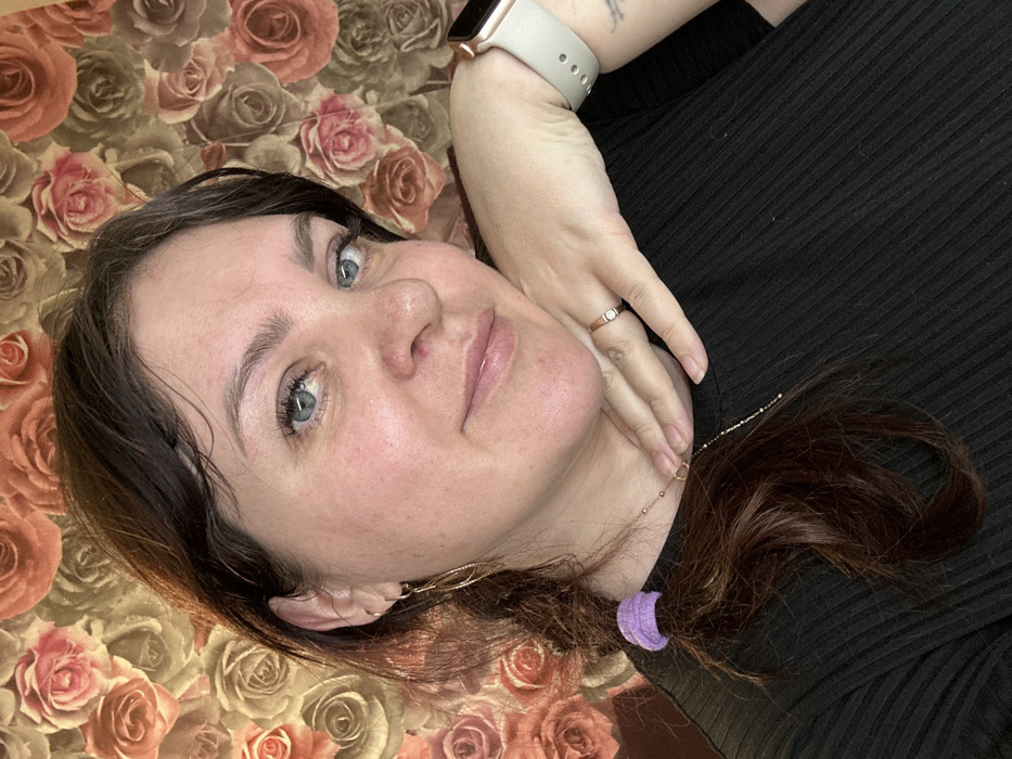 A woman with light skin and blue eyes lies on a floral-patterned surface. She wears a black ribbed shirt, a gray smartwatch, and a ring. Her dark hair is partially tied back with a lavender hair tie, and she has gold hoop earrings and a delicate necklace. Her hand rests on her neck, and she looks at the camera with a slight smile.