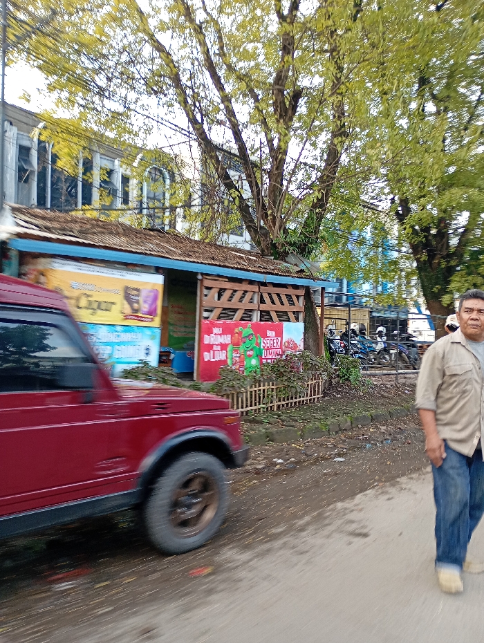 A burgundy SUV speeds by a street scene. The vehicle’s tire is a dark bronze. A man stands on the right, facing forward, wearing a tan shirt and jeans. Behind them, a small shack with advertisements sits below a building with arched windows. Trees with light green foliage dominate the background. Several motorcycles are parked nearby.