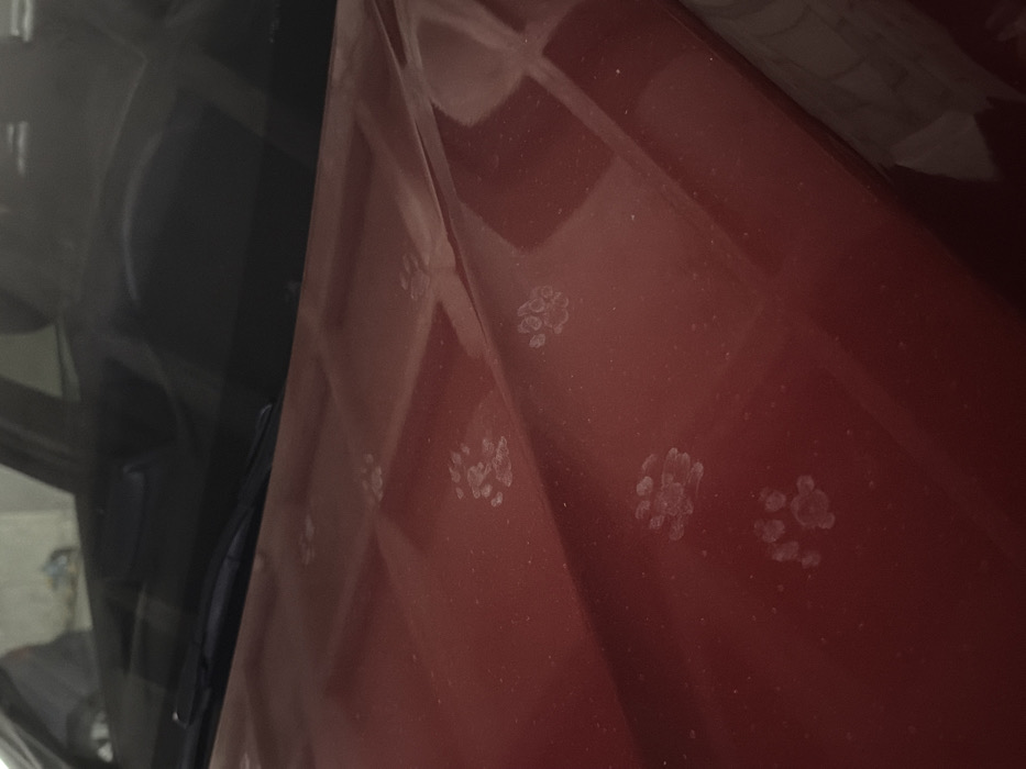 The image displays the dusty red hood and lower windshield of a vehicle, located in Santa Clara Ocoyucan, Mexico. Numerous distinct paw prints, consistent with a small to medium-sized quadrupedal animal, are impressed into the layer of dust covering the car's hood. The windshield, featuring a single wiper blade, occupies the upper portion of the frame. The blurry background visible through the windshield and reflections on the car's surface suggest an indoor or covered parking environment. No individuals are present in the scene.
