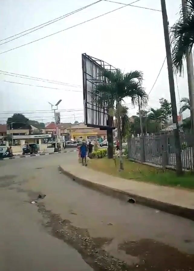 street view in an urban area, likely during daytime. The sky is overcast. The camera is positioned on a road, looking towards an intersection. The road surface is asphalt, with visible signs of wear and tear, including patches and puddles. On the right side of the frame, there's a sidewalk, a fence, and some palm trees. A large billboard structure, with its frame visible, stands to the right as well. Several buildings are visible across the intersection. Two cars are driving across the intersection. A person is walking on the sidewalk in the same direction the camera is facing. There are electrical wires running above the street. A traffic light is seen to the left, showing a green light.