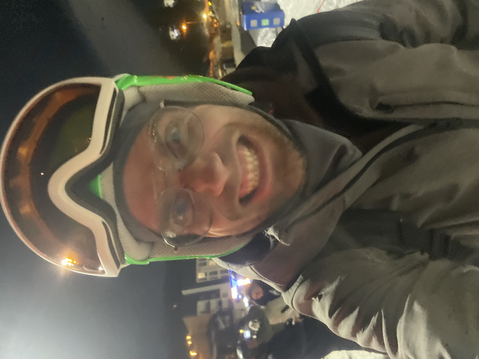 This image depicts a close-up, upward-angled selfie of an adult male in Jahorina, Bosnia and Herzegovina, at night. The subject is positioned centrally, visible from the chest up, and wears winter sports gear. He is equipped with a white and green ski helmet, over which orange-tinted ski goggles are positioned. Clear-framed eyeglasses are worn over his eyes. His face displays an intense, exaggerated grin, with his mouth open and teeth clenched, and his eyes wide and fixed on the camera. He wears a gray zippered winter jacket, with a dark interior layer visible, and a gray neck warmer or balaclava covers his lower face and neck. A dark strap, consistent with a backpack or bag, is visible over his left shoulder. The background is dark, indicating nighttime, with various artificial light sources illuminating the scene. Snow is present on the ground. Blurred figures of other individuals are discernible in the left background, suggesting a populated area. One of these individuals appears to be holding a mobile device or camera. Distant buildings with illuminated windows and streetlights are visible in the mid-ground, indicating a developed area within a ski resort setting. A blue utility box or container is partially visible in the snow on the right side of the background.