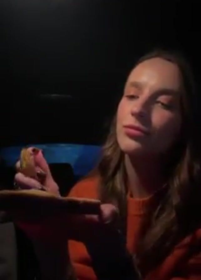 young, fair-skinned woman with brown hair sitting in a car. She's wearing an orange sweater and looking directly at the camera. She holds a piece of what appears to be bread or toast in one hand and uses a small wooden spoon in the other to spread something light brown and creamy on it. The lighting is dim, but there's a ring light above, providing some illumination. The car's interior is mostly black, and a blurred, indistinct scene can be seen through the back window.
