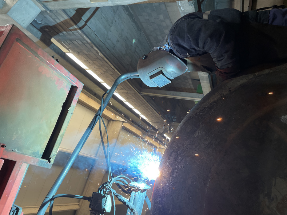 The image captures an industrial welding operation occurring within a workshop in Tomba, Montenegro