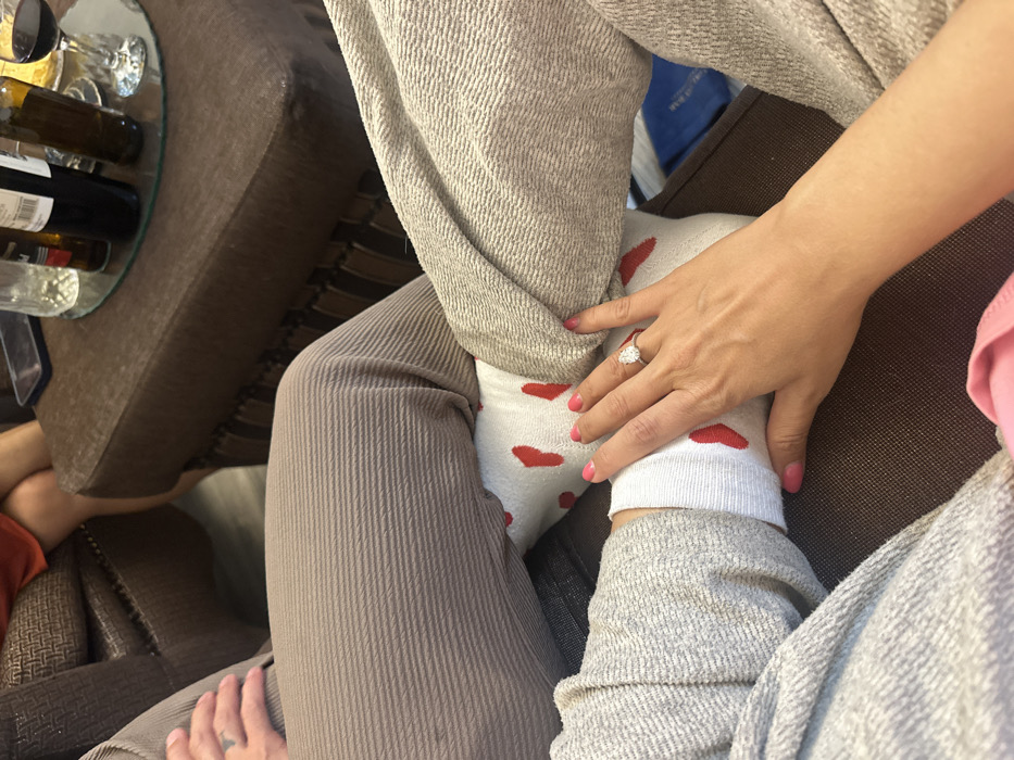 The image depicts an indoor scene within a private residence in Mitchells Plain, South Africa. The perspective is downward, focusing on an interaction between two individuals with a third visible in the background. In the foreground, a right hand with pink manicured nails and an oval-cut diamond ring on the fourth finger rests on another individual's sock-clad foot. The hand's owner is wearing light grey, textured casual trousers. The foot is covered by a white sock patterned with multiple red hearts, and its owner wears light brown, vertically ribbed casual trousers. In the mid-background, a brown upholstered ottoman or coffee table supports a circular mirrored tray. On the tray are a dark smartphone, a red wine bottle, multiple brown glass bottles, a clear beverage glass, and a wine glass containing red liquid. To the upper left, an upholstered armchair is partially visible, occupied by a third person whose lower legs are seen wearing an orange garment. The floor is light in color.