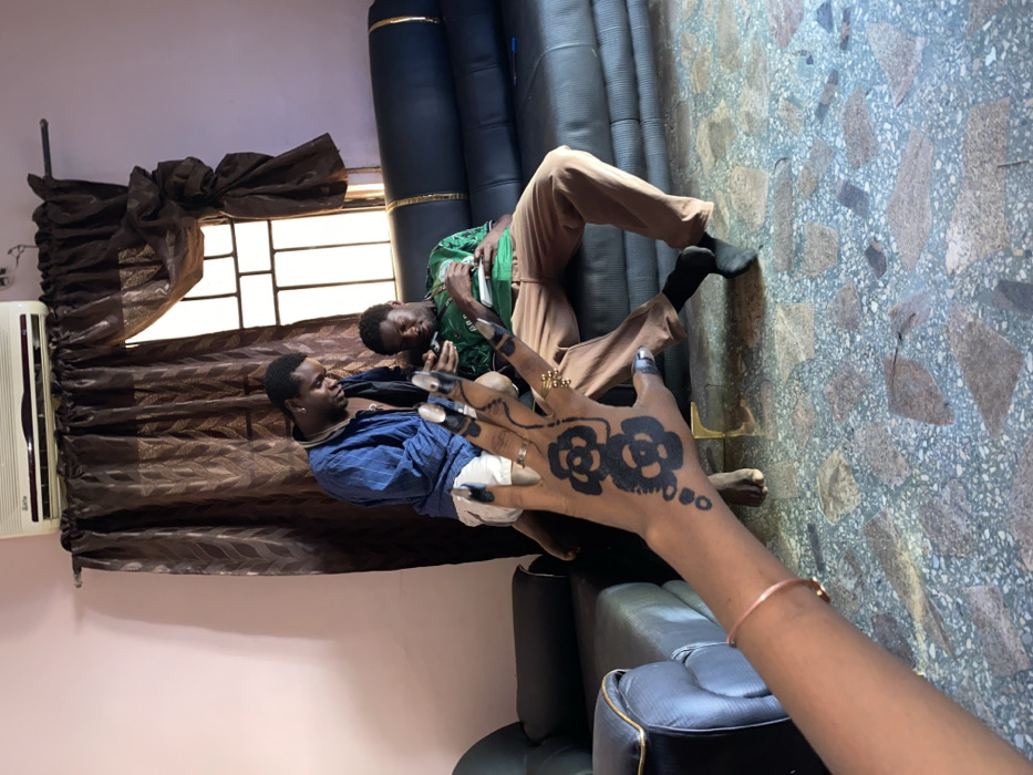 The image depicts an indoor scene in what appears to be a residential living space in Narayi, Nigeria. In the immediate foreground, a dark-skinned forearm and hand are extended towards the camera. The back of the hand is elaborately decorated with dark henna (or similar dye) patterns, featuring two stylized rose motifs and a trail of dots. The fingernails are painted a dark color. A thin copper-colored bracelet is worn on the wrist, and gold-colored rings are on the index and ring fingers. In the midground, two males are present. One male, wearing a blue pinstriped long-sleeve shirt over a dark undershirt and light-colored shorts, is leaning over, seemingly observing a smartphone held by the second male. This first male has dark hair. The second male is seated on a black sofa, wearing a green short-sleeved shirt (possibly a jersey) and light brown trousers with dark socks. He is actively engaged with a white smartphone in his hands, looking down at its screen. The background shows a room with light pinkish-tan walls and a floor composed of irregular, multi-colored stone fragments, possibly terrazzo or a similar tile. A window on the right is covered by brown, patterned curtains and features white security bars. Above the window and curtains, a white air conditioning unit is mounted on the wall. Black leather-look sofas, detailed with gold-colored trim, are visible. The overall scene suggests a relaxed, casual interaction within a home setting.