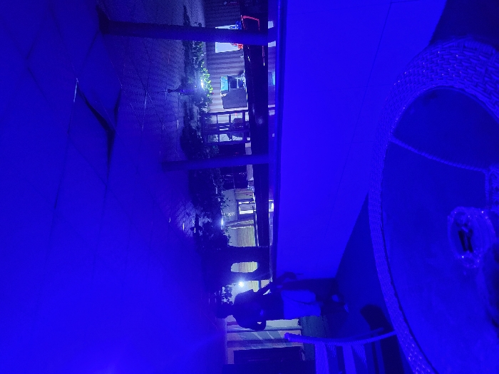 An outdoor patio area with dim, blue lighting
