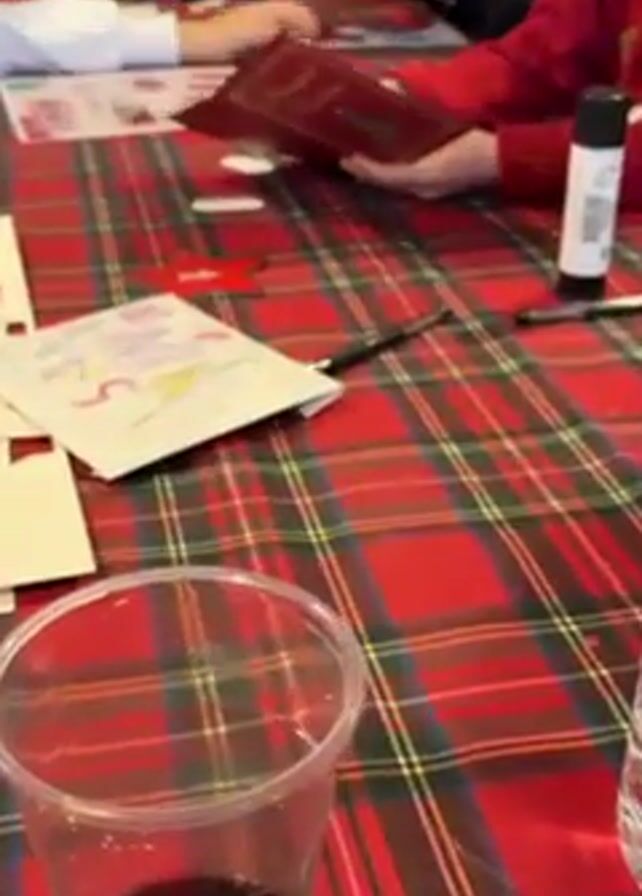 table covered with a red and green plaid tablecloth. A clear plastic cup filled with a dark liquid sits in the foreground. Several people are seated around the table. They are working on craft projects, including assembling small red boxes, making cards, and drawing. Writing implements and craft supplies are scattered across the table. One person is wearing a red sweater.