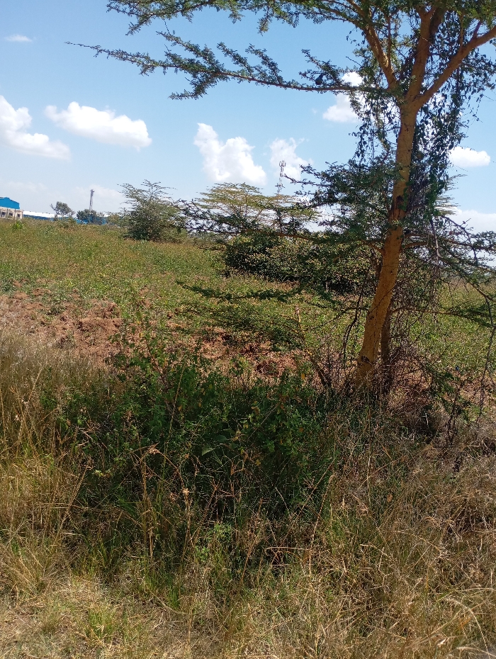 The image depicts an open, vegetated landscape in Mosop ward, Kenya, under a clear blue sky with scattered white cumulus clouds